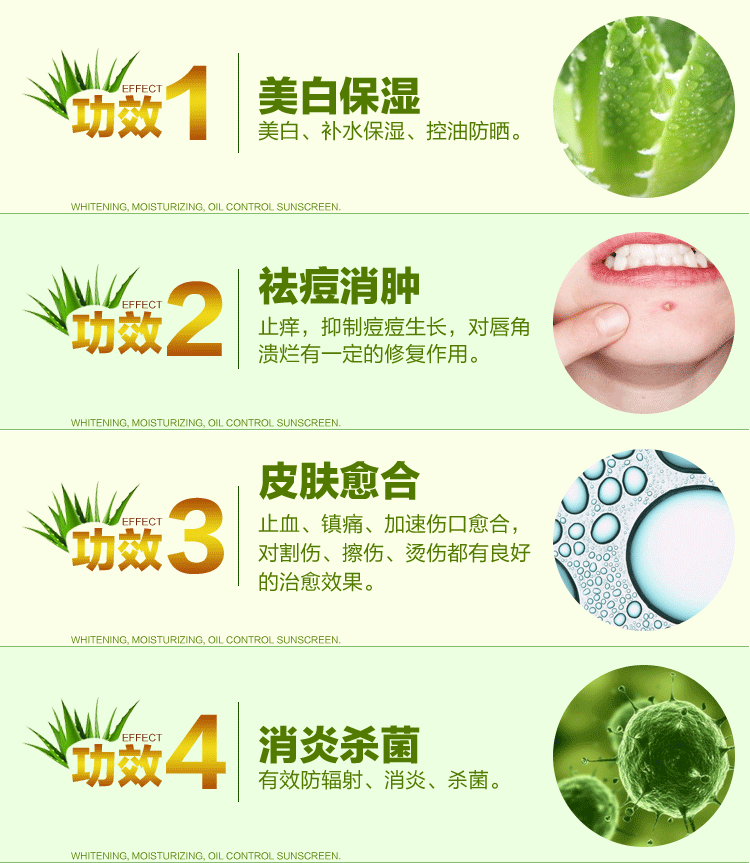 | 多重用途,补水之王,保湿、消yan、消zhong、止痛、止痒、止血 永恒芦荟胶乳是含有润湿剂、浓稠剂及滋润剂之浓厚凝胶,能有效使纯净的稳定芦荟凝胶渗进皮肤。能给予日晒后失去水分的肌肤更深层的滋润与养分,并迅速修护肌肤,汇集芦荟凝胶、天然草本精华,不含油脂,能迅速滋润肌肤,并舒缓不适感,并使您的肌肤恢复健康。 1、具有抗细菌感染、治伤、滋润及舒缓特别敏感部位等作用,可促进伤口的愈合,有助于消除痕迹,能够减轻痛、痒、肿的不适。 2、芦荟凝胶能给予烫伤、擦伤的肌肤更深层的滋养与养分,并加速修复受损的细胞组织,促使细胞再生。 3、芦荟胶乳对于干裂及日晒后失去水分的肌肤,能迅速为肌肤吸收达到滋润的效果,使肌肤恢复健康。 4、芦荟胶乳可用于急性的皮肤、肌肉、关节损伤及帮助止血 5、芦荟胶乳不含油脂,故适宜治理粉刺、脓包、皮脂漏、头皮、秃发、皮硬化及各种皮肤病,可达到深层消炎补水的功效。 6、它的酸碱值为4.5(pH4.5),无刺激性,配合芦荟活化剂敷用,可达双重效能。 7、适用于眼部周围(敷用时仍须小心,谨防胶乳入眼而引致不适)。 自古以来芦荟就被视为「青春之泉」,是大家熟知的美容保养圣品,永久芦荟胶含有高浓度的100%穩定芦荟凝胶,具有芦荟的天然保养功效,为了让大家更加了解芦荟胶的益处,在今年2至3月份委託嘉南药理科技大学化妝品科技研究所陳荣秀与林清宮教授共同主持「芦荟凝胶对細胞损伤之修复与保护效能评估」的实验,透过這些数据分析,你將更肯定永久芦荟胶的美容保养效果。  永恒芦荟胶的保湿、保护、修复实验说明 委托嘉南药理科技大学化妆品科技研究所进行「芦荟胶对受损细胞之修复与保护实验」,并与同样具有保湿盛名的「玻尿酸」、「山梨醣醇」进行对照实验。 ● 检测细胞种类:人类皮肤组织母细胞 检测评估項目: - A 细胞在室溫下之耐干试验 检测保湿效果