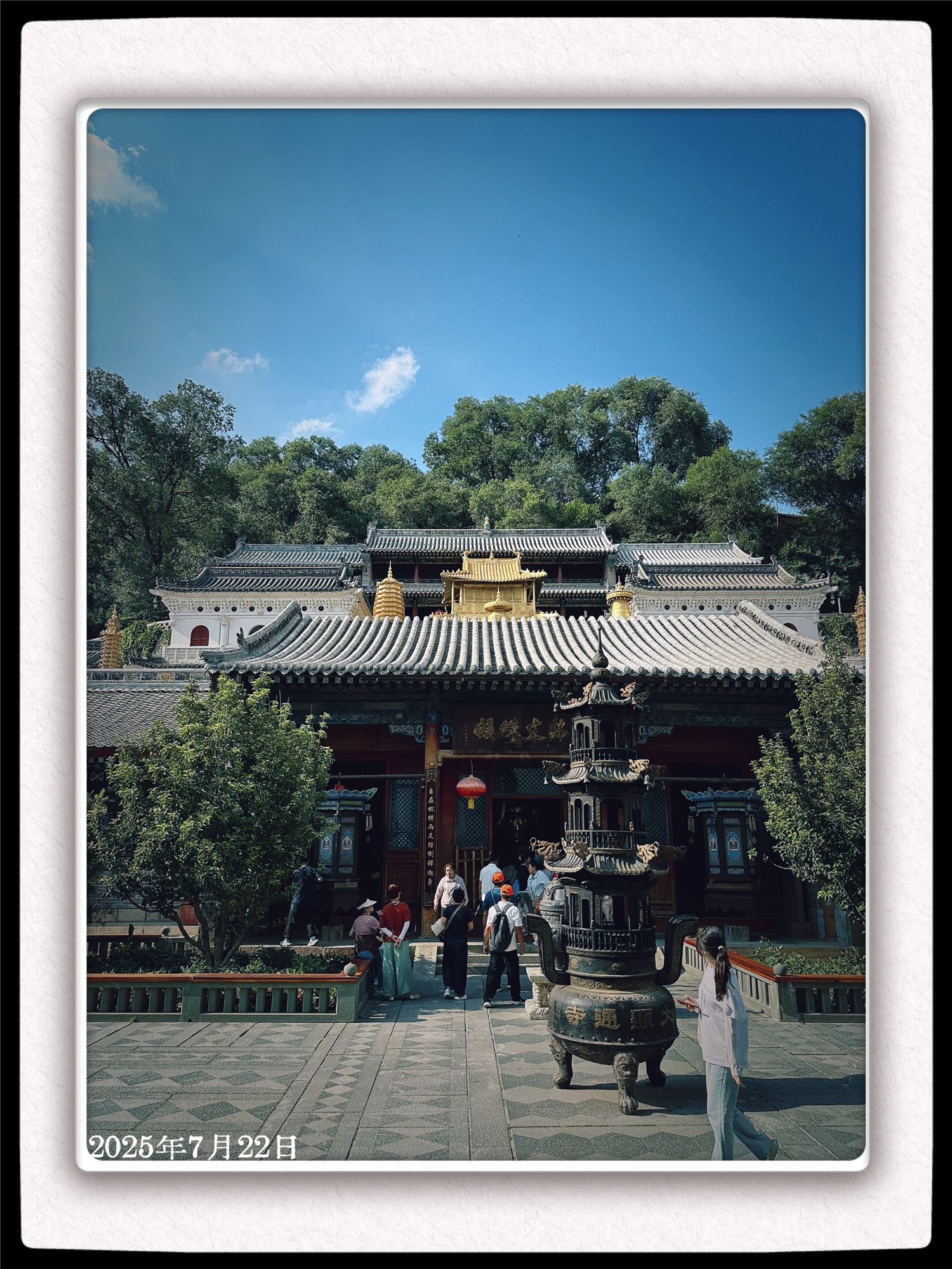从山脚仰望,在湛蓝的天幕下,一缕缕白云掠过,一丛丛红墙黄瓦的寺院,光芒闪烁,宛若漂浮在云间的天上宫阙;自山顶俯瞰,在浓淡起伏的绿海里,一座座高低不同的白塔,一幢幢金黄、绛jiàng红的庙宇就像闪耀在绿波中的海市蜃楼。你会不由自主地感叹:五台归来不看庙!