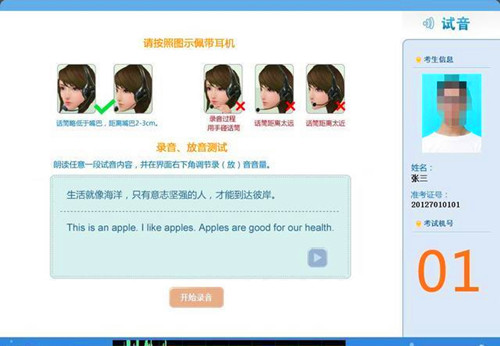 第二步:朗读任意一段试音内容,并根据实际情况调节音量。点击”开始录音“,录音完成后系统自动播放考生录音信息。
