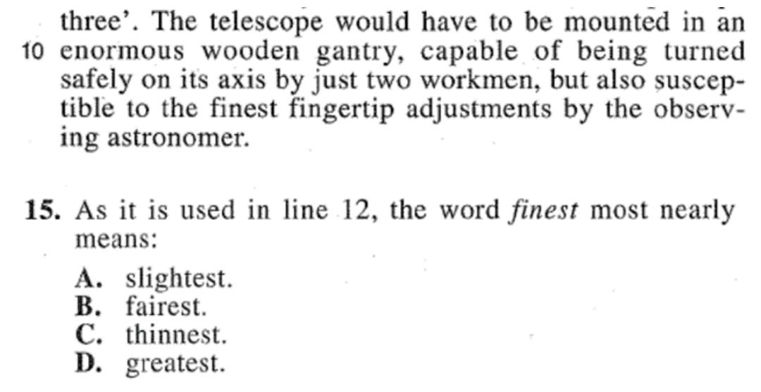 请你把该词带回原文,原句说的是望远镜能敏感地适应天文学家指尖的微调 the finest fingertip adjustment,因此,finest 指程度小,对应选项slightest。此外,4个选项差别比较大,不会轻易造成混淆。