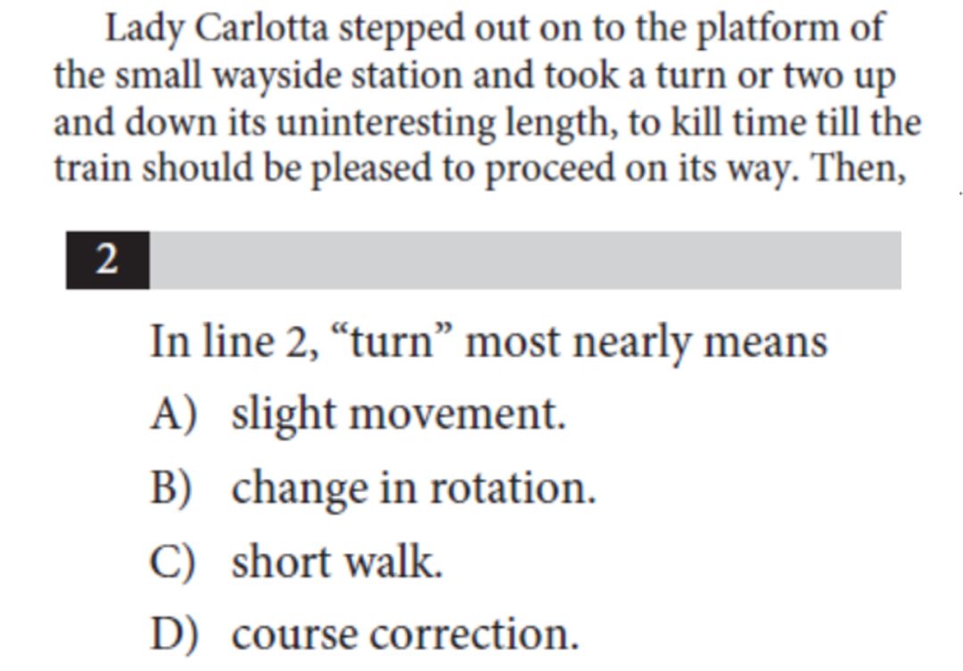 看到这道题,意不意外?惊不惊喜?谁还不认识turn 啊?CB简直是侮辱我的智商嘛!事实却是:这道题80%的人会选错,因为ABCD四个选项都是turn 的基本含义,因此,很多考生会觉得哪个都对。仔细分析,此句描述Lady C.在站台上为了打发时间来回走动(画面感很强),因此,take a turn 是指走动,选C。