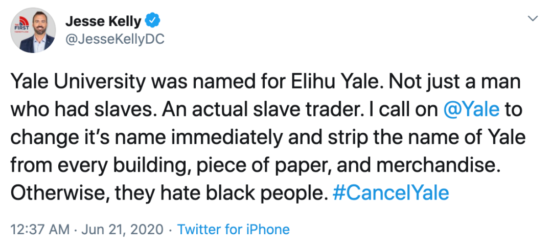 耶鲁大学是以伊利胡·耶鲁的名字命名,他不仅是一个奴隶主,同时也是一个黑奴贩卖者。我号召耶鲁大学立即改名字,并且除去所有建筑物、文件、商品上 Yale 的名字。否则他们会一直恨黑人。