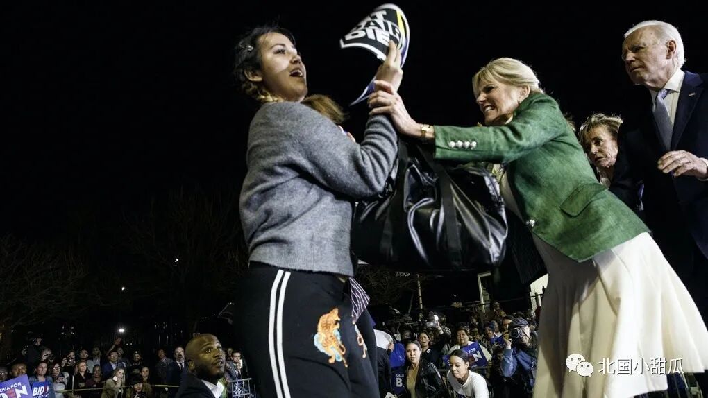 3月3日,拜登正在洛杉矶举行集会演讲,一位抗议者猛然冲上台,手中领着“不明危险品”。