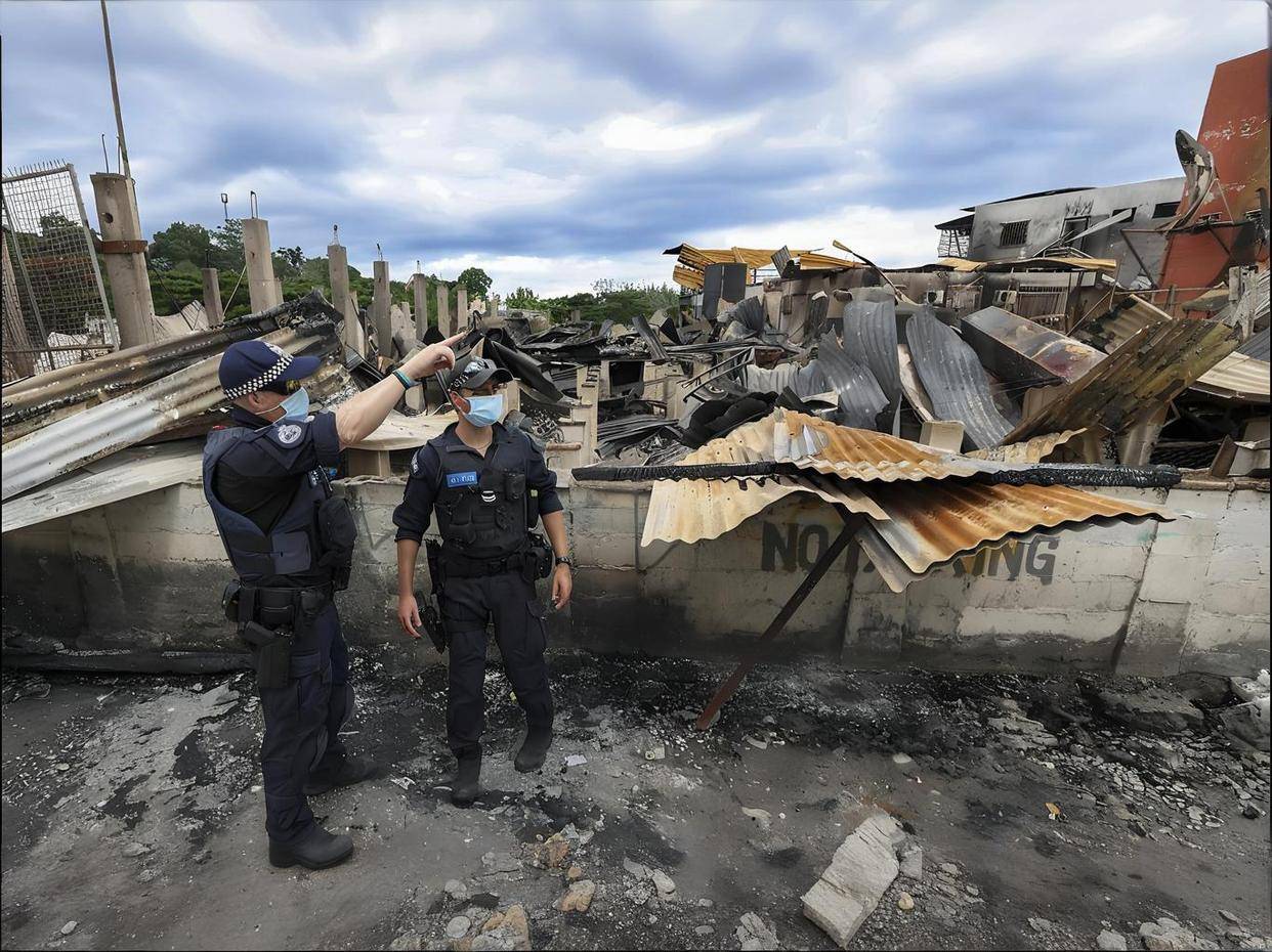 首都霍尼亚拉的唐人街,几乎被夷为平地,华人商铺被洗劫一空,烈火熊熊燃烧。