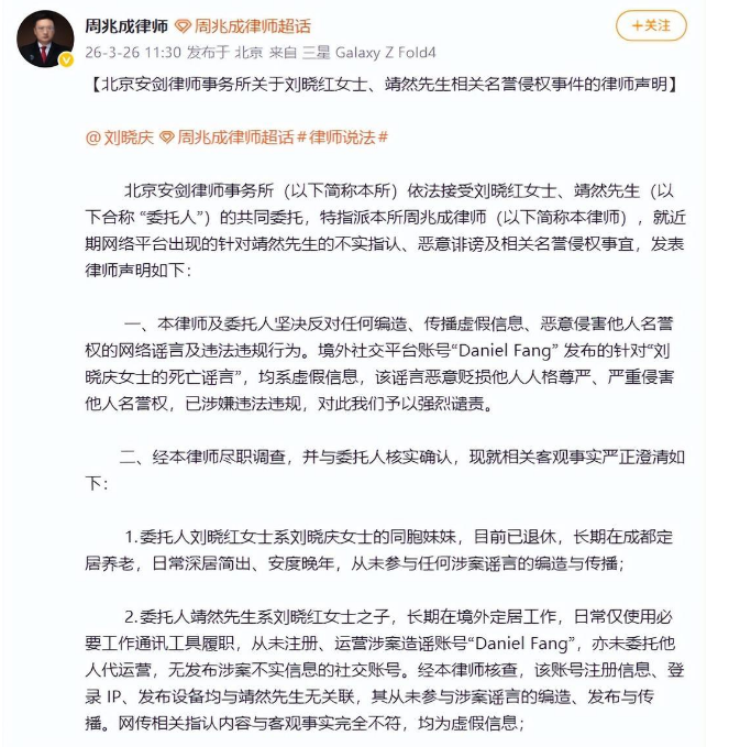 3月26日,北京安剑律师事务所发布关于刘晓红女士、靖然先生相关名誉侵权事件的律师声明: 一、本律师及委托人坚决反对任何编造、传播虚假信息、恶意侵害他人名誉权的网络谣言及违法违规行为。境外社交平台账号“Daniel Fang” 发布的针对“刘晓庆女士的死亡谣言”,均系虚假信息,该谣言恶意贬损他人人格尊严、严重侵害他人名誉权,已涉嫌违法违规,对此我们予以强烈谴责。 二、经本律师尽职调查,并与委托人核实确认,现就相关客观事实严正澄清如下: 1.委托人刘晓红女士系刘晓庆女士的同胞妹妹,目前已退休,长期在成都定居养老,日常深居简出、安度晚年,从未参与任何涉案谣言的编造与传播; 2.委托人靖然先生系刘晓红女士之子,长期在境外定居工作,日常仅使用必要工作通讯工具履职,从未注册、运营涉案造谣账号“Daniel Fang”,亦未委托他人代运营,无发布涉案不实信息的社交账号。经本律师核查,该账号注册信息、登录 IP、发布设备均与靖然先生无关联,其从未参与涉案谣言的编造、发布与传播。网传相关指认内容与客观事实完全不符,均为虚假信息; 3.网络上传播的关于委托人一家 “希望刘晓庆女士无后代”“窃取珠宝”“恶意诬告违建” 等内容,均系无事实依据的恶意捏造,委托人对此予以强烈谴责。就双方家庭过往,委托人一家始终铭记刘晓庆女士早年对靖然先生的帮扶照拂,不忘血脉亲情与恩情。家庭内部分歧本应内部妥善化解,不应置于公共舆论场发酵,更不该以不实指控激化矛盾。