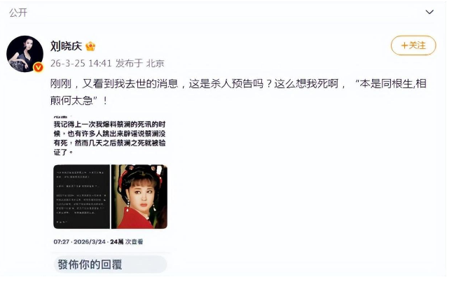 据红星新闻此前报道,3月25日,演员刘晓庆发文回应网传她“在横店游泳池里去世”的消息:“刚刚,又看到我去世的消息,这是杀人预告吗?这么想我死啊……”