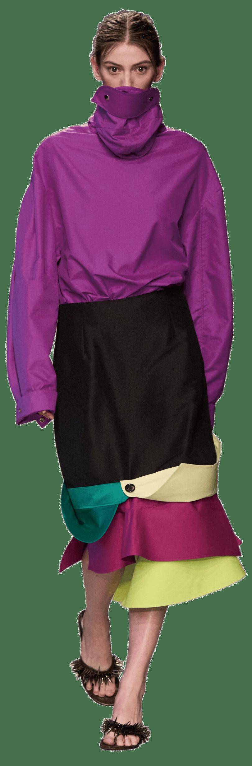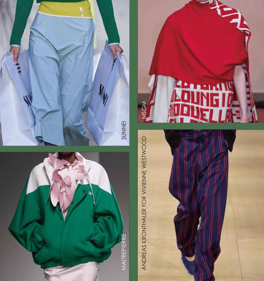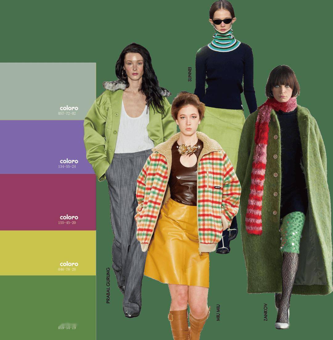 无处不在的潮流运动元素为休闲通勤品类注入非凡活力。为打破传统通勤装的沉闷,可选用银莲紫与青草绿等酸性色彩形成醒目的视觉焦点,同时搭配华丽丝绸、功能性哑光材质、质感长毛绒、潮趣针织等。
