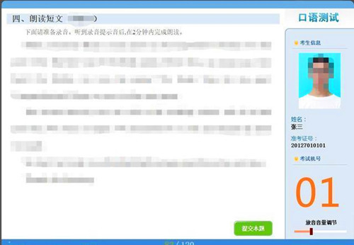 第二步:朗读任意一段试音内容,并根据实际情况调节音量。点击”开始录音“,录音完成后系统自动播放考生录音信息。