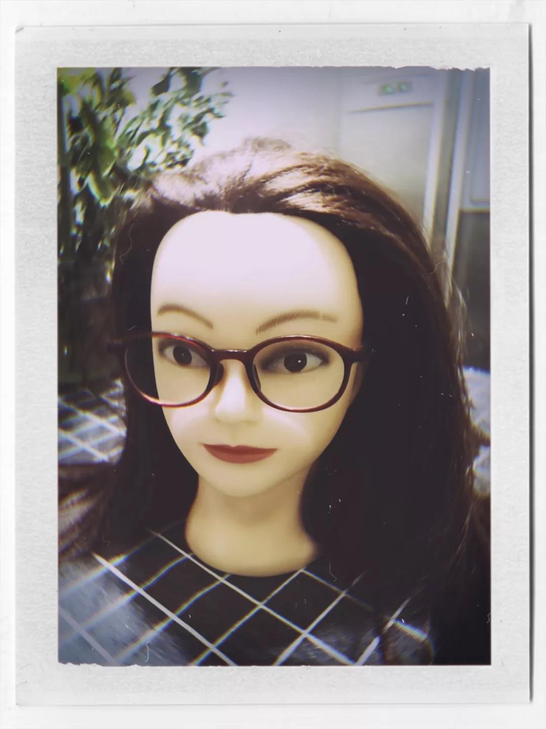 起初她只是给脑袋带一些眼镜啊帽子之类的。你看,这颗脑袋戴起眼镜来是不是颇有些知性美呢?是吧,我也觉得确实挺好看的,但你以为她一直玩得这么岁月静好就错了,事实上,我只见过很少几次这么正常的“妆容”,因为她很快从美发行业杀入了彩妆领域,显然她并不打算为人类传播美,她走的都是这个路线: