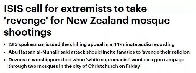 ISIS公布了一段长达44分钟的音频资料,内容是ISIS领导人Abu Hassan al-Muhajir宣称将针对新西兰恐袭事件展开报复行动。