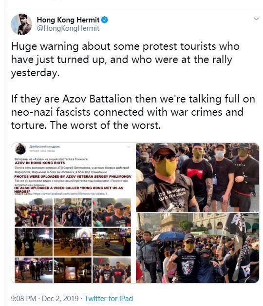 这一消息也得到了另一个境外社交平台“推特”上一些“大V”和“记者”的确认。比如一直活跃在香港的英文圈,并支持香港黑衣蒙面人的自由撰稿人@HongKongHermit,就发帖表示香港街头确实来了一群乌克兰的极右翼新纳粹分子。