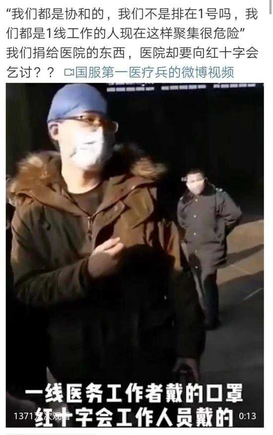 视频的拍摄地点在武汉国博,一线医务人员戴着普通医用口罩正在向红十字会工作人员讨要物资。最终空手而归。