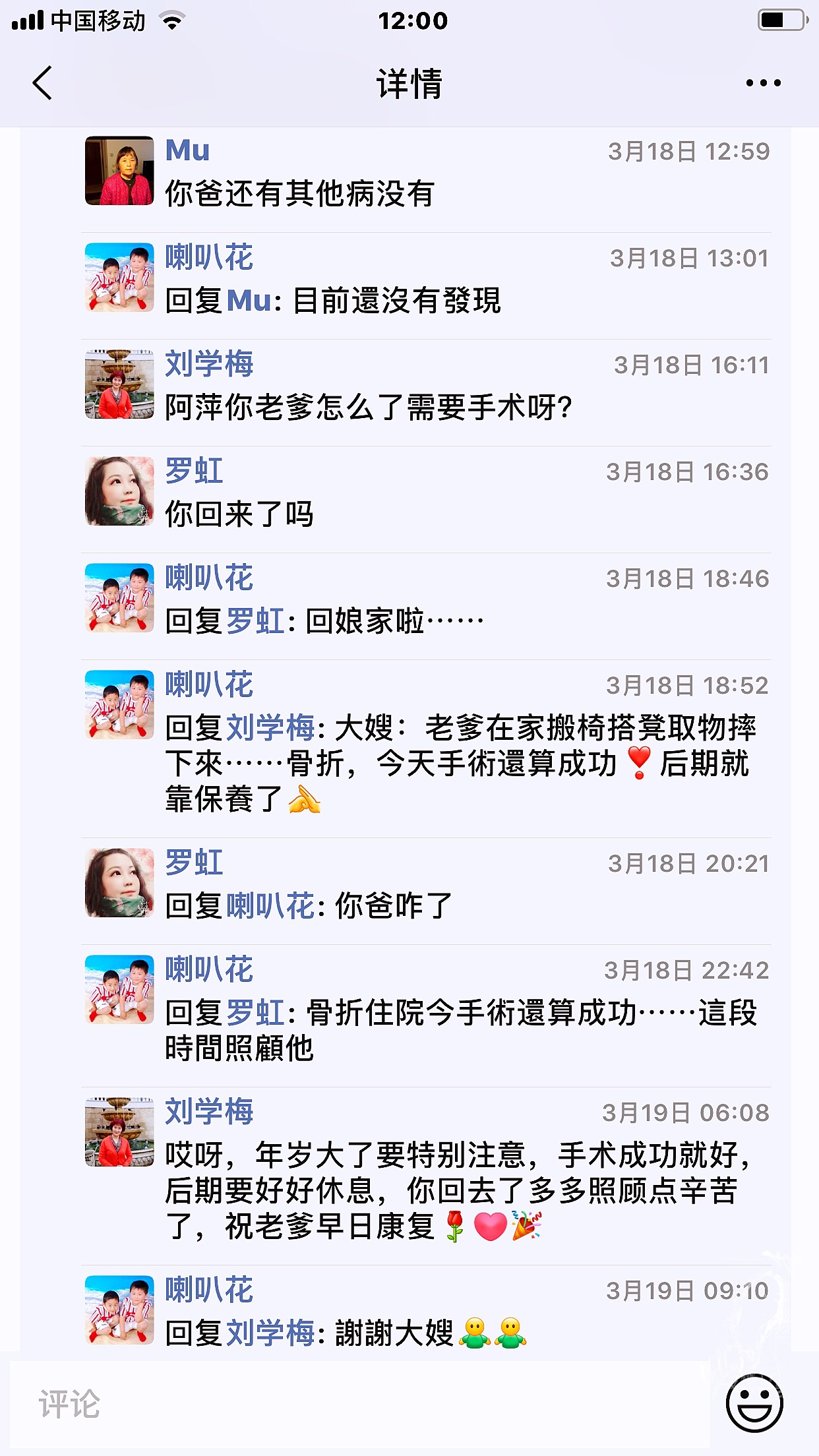爸爸的亲二哥,也是现唯一的哥哥一家子从美国加利福利亚与爸爸视频问候;大儿子听说姥爷摔伤后情绪不太好,在上海与姥爷微信问好;小儿子在山大也给姥爷问候请安。。。。。。有了亲人们的问候,老爸心情大好,也开始积极配合治疗。