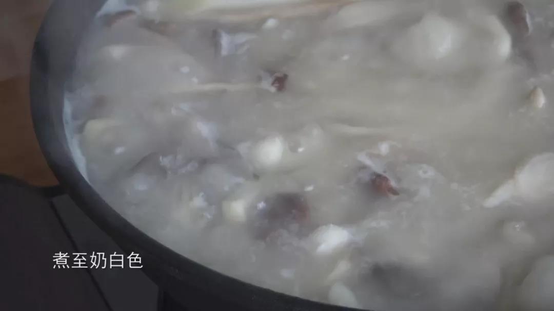 8、然后将各种菌菇也倒进去,盖上锅盖焖煮,煮至奶白色;