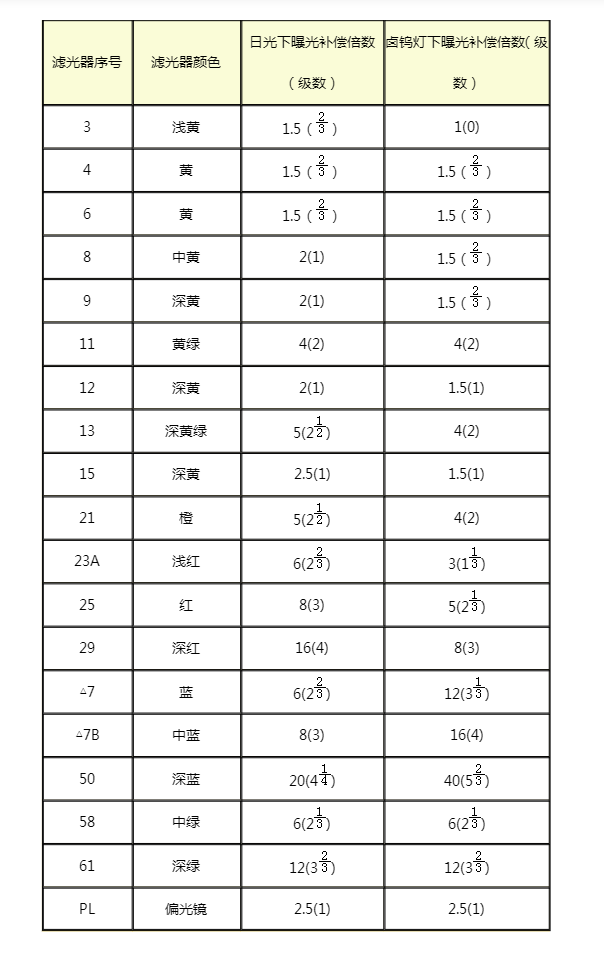 2. 如果自己有滤光镜,请测量一下所用滤光镜的曝光补偿倍数,并在使用滤镜时加以注意,尤其在单反相机之外的相机加用滤镜时要尤其注意。