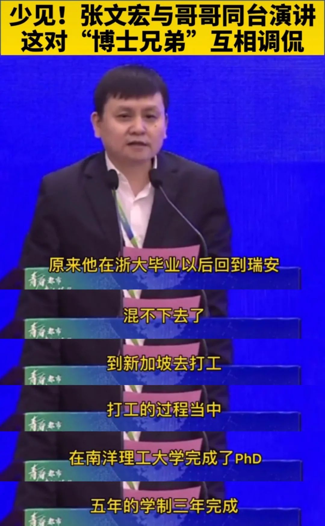 张文宏不用多说了,家喻户晓的抗疫专家,上海市新冠肺炎医疗救治专家组组长。1989年毕业于浙江大学,之后又拿到了新加坡南洋理工大学博士学位,研究人工智能、智能制造等,也是业界大牛。“他从浙大毕业以后,回到瑞安混不下去了,就到新加坡打工。”“他在打工的过程当中,居然在南洋理工大学完成了PhD的培训,五年的学制三年完成。”“在那里工作了几年,又回到了浙江,是浙江大学把他挖过去做计算机学院的院长,做了几年后,现在是浙江财经大学人工智能学院的院长。”又是“打工”,又是“混不下去”的,看似调侃、嘲讽,实则句句都在夸哥哥。如此优秀的兄弟俩,让围观群众越看越羡慕,纷纷表示:“这家庭也太厉害了”“我要是他们妈妈,做梦都要笑醒了”。