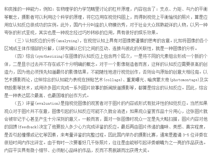 关注老师课堂讲解,识记:认知反应、情绪反应、精神运动反应;领会:感觉剥夺、知觉准备、知觉防御、场依赖与场独立;应用:感觉剥夺、知觉准备、知觉防御、场依赖与场独立等知觉现象在摄影中的运用。