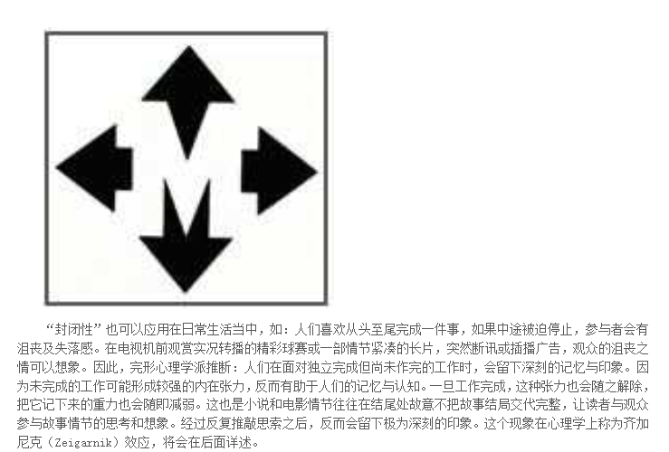 本章主要讲授九个方面的内容:心理学的定义、格式塔、 完形律的封闭性、完形律的连续性、完形律的相似性、完形律的接近性、共同命运、视觉伪装、异质同形。要求对完形心理学的视觉法则作深入了解。