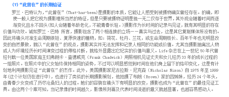 关注老师课堂讲解,结合相关图片,领会:摄影者的视觉问题、决定性的瞬间、知面与刺点、气氛、特殊的角度与观点、 信息的隐藏、“此曾在”的长期验证、社会意识的体现、重复的图案或形式、形式的平衡与对称、 幽默感或人情味的呈现、形式上的对比、反射或映照的影像、投影(影子效应)、形态切断、变形与联想、空间交错、视觉推移。应用:完形训练与摄影策略、摄影家营造美感的视觉策略。