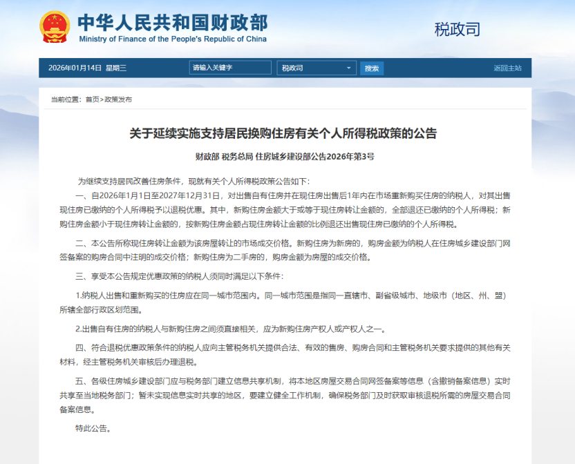 1月14日,财政部、税务总局、住房城乡建设部联合发布《关于延续实施支持居民换购住房有关个人所得税政策的公告》。(以下简称《公告》)