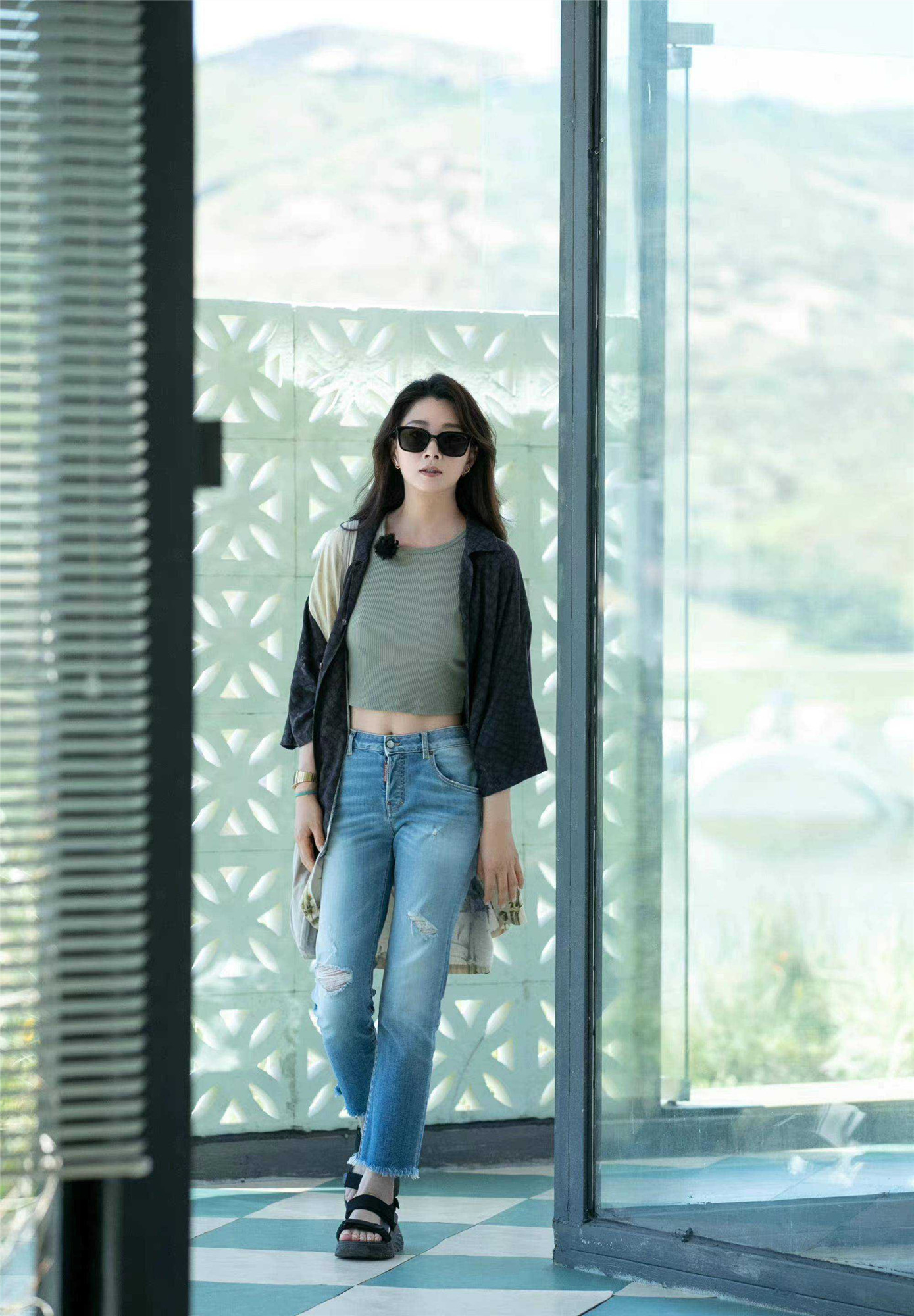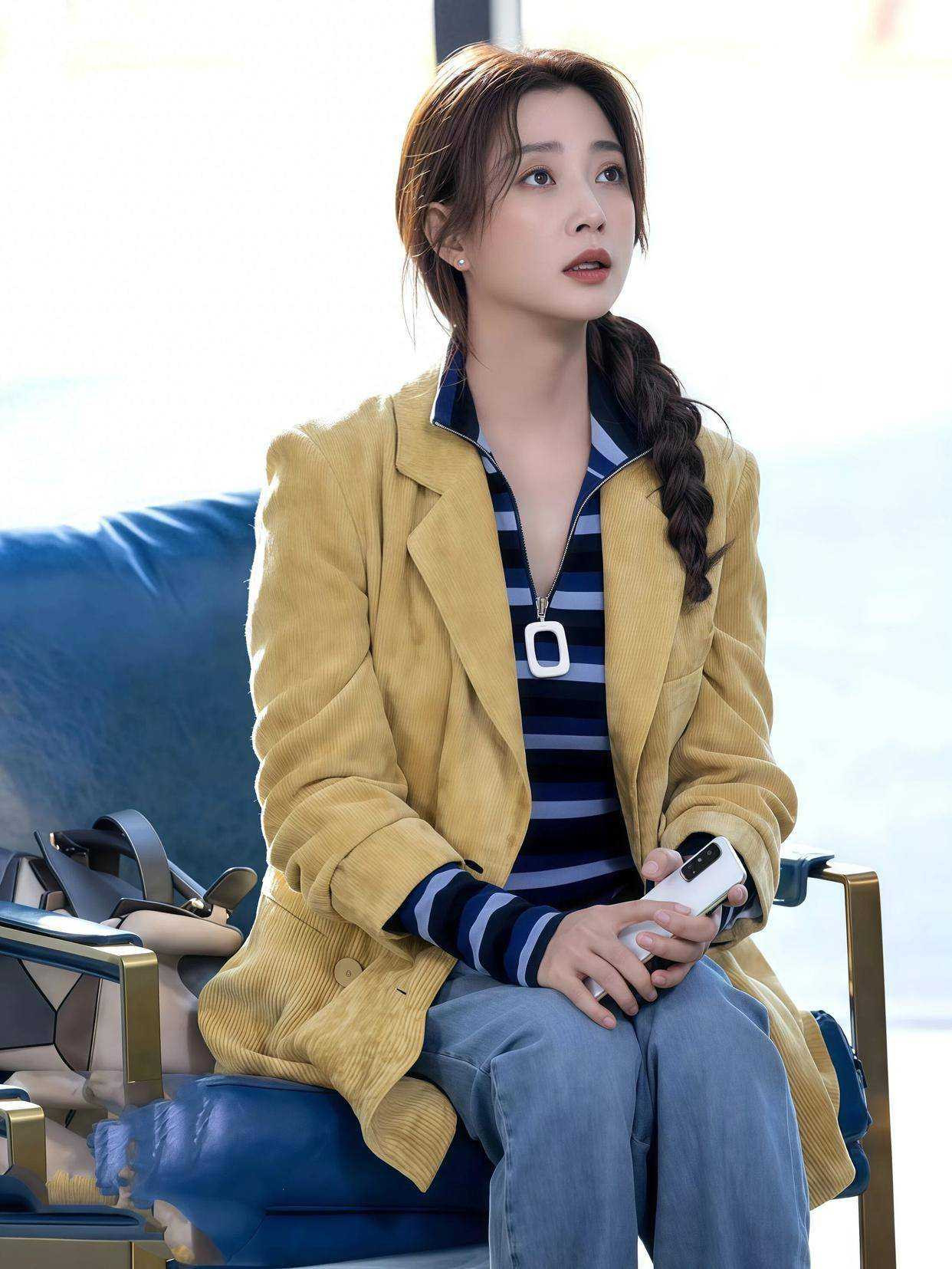 更绝的是她对“简约”的理解。去年夏天她穿的波点衬衫配格子半身裙,明明是两件印花单品,却因为选了低饱和度的莫兰迪色系,硬是搭出了法式慵懒感。衬衫故意解开两颗扣子,露出纤细的锁骨;裙子长度盖过膝盖,既遮小腿肌肉又显腿长。连发型都透着巧思——半扎微卷发,既不像黑长直那么刻板,又比全扎发多了几分柔和。这种“lessismore”的智慧,让她在机场生图里随便一站,都像时尚杂志的街拍大片。