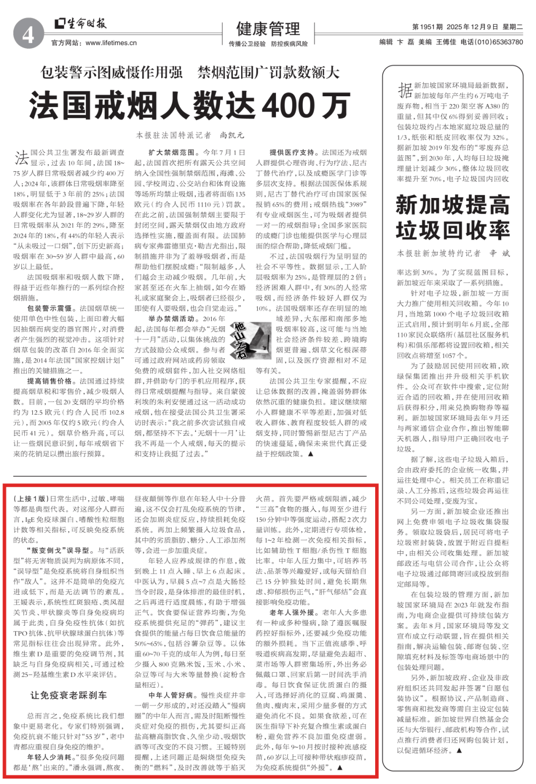 慢性炎症并非一朝一夕形成的,对还没踏入“慢病圈”的中年人而言,需及时阻断慢性炎症对免疫的损伤,尤其要纠正高盐高糖高脂饮食、久坐少动、吸烟饮酒等可改变的不良习惯。王媛特别提醒,上述问题正是焖烧型免疫失衡的“燃料”,及时改善就等于掐灭火苗。首先要严格戒烟限酒,减少“三高”食物的摄入,每周至少进行150分钟中等强度运动,搭配2次力量训练。此外,定期进行专项体检,每1~2年检测一次免疫相关指标,比如辅助性T细胞/杀伤性T细胞比率。中年人压力集中,可培养书法、品茶等兴趣爱好,或每天留给自己15分钟独处时间,避免长期焦虑、抑郁损伤正气,“肝气郁结”会直接影响免疫功能。